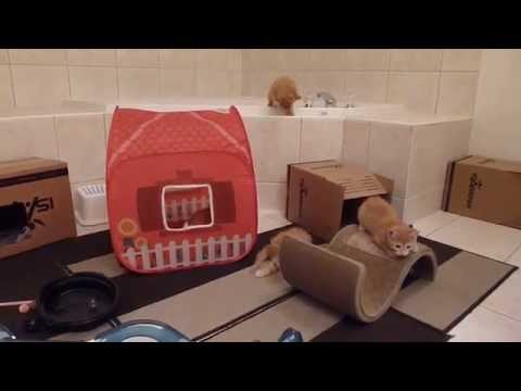 Im Bad ist es schön warm. Ideal also, für kleine Katzen zum spielen und tollen. Wieder einmal erweisen sich zudem alte Schachteln als ideales und billiges Katzenzubehör.